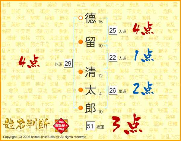德(15画)留(10画) 清(12画)太(4画)郎(10画)