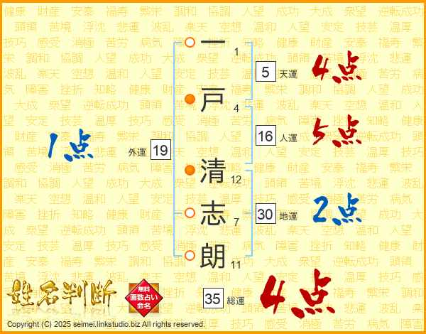 一(1画)戸(4画) 清(12画)志(7画)朗(11画)