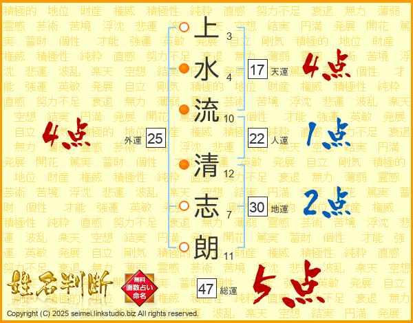 上(3画)水(4画)流(10画) 清(12画)志(7画)朗(11画)