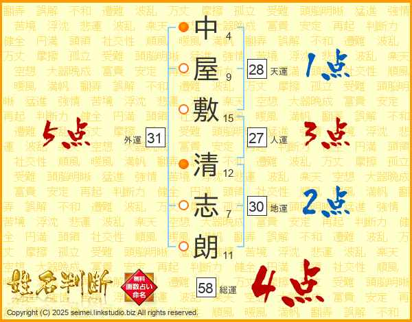 中(4画)屋(9画)敷(15画) 清(12画)志(7画)朗(11画)