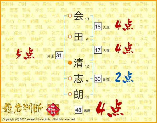 会(13画)田(5画) 清(12画)志(7画)朗(11画)