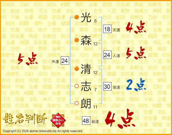 光(6画)森(12画) 清(12画)志(7画)朗(11画)