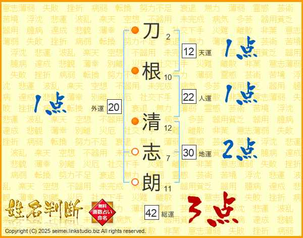 刀(2画)根(10画) 清(12画)志(7画)朗(11画)
