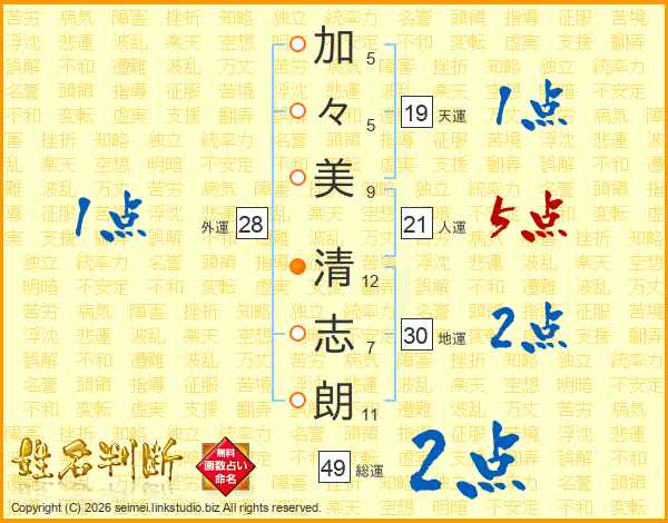 加(5画)々(5画)美(9画) 清(12画)志(7画)朗(11画)