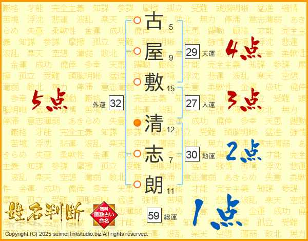 古(5画)屋(9画)敷(15画) 清(12画)志(7画)朗(11画)