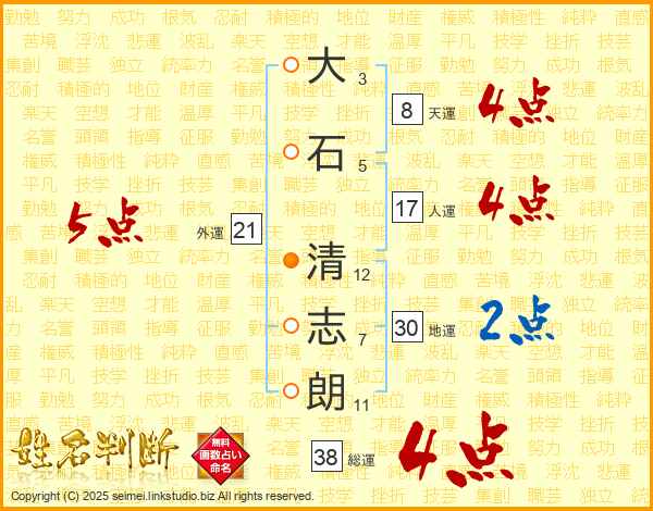 大(3画)石(5画) 清(12画)志(7画)朗(11画)