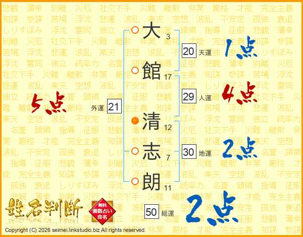 大(3画)館(17画) 清(12画)志(7画)朗(11画)