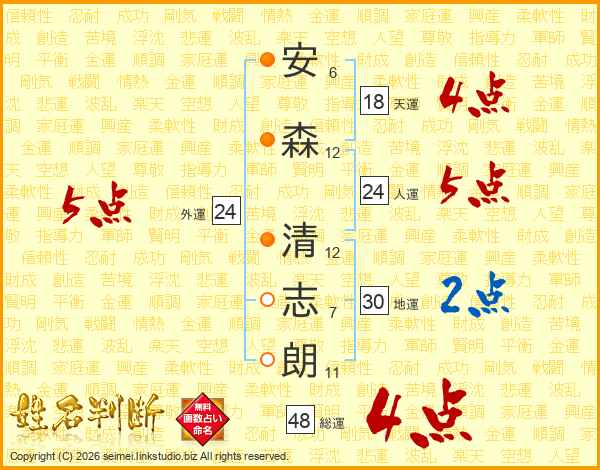 安(6画)森(12画) 清(12画)志(7画)朗(11画)