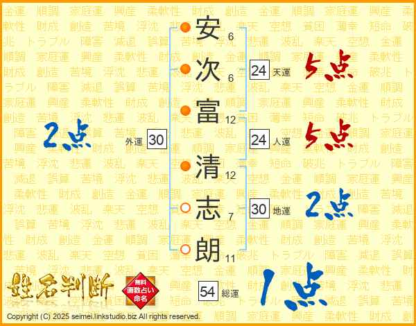 安(6画)次(6画)富(12画) 清(12画)志(7画)朗(11画)