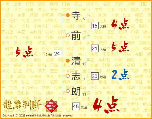 寺(6画)前(9画) 清(12画)志(7画)朗(11画)