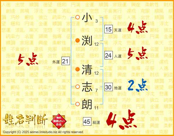 小(3画)渕(12画) 清(12画)志(7画)朗(11画)