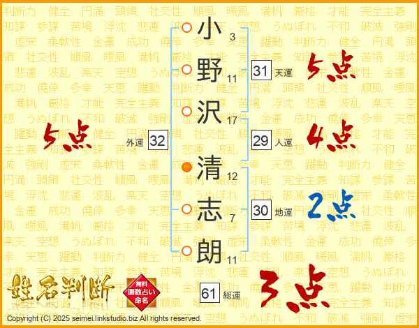 小(3画)野(11画)沢(17画) 清(12画)志(7画)朗(11画)