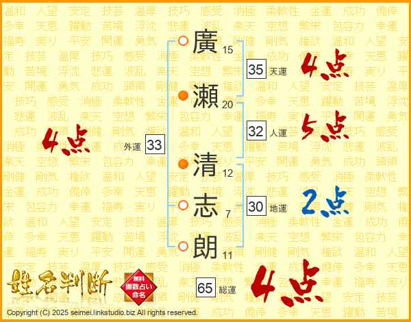 廣(15画)瀬(20画) 清(12画)志(7画)朗(11画)