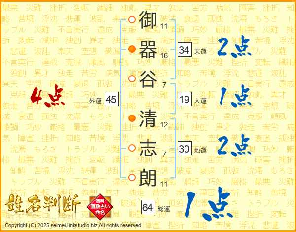 御(11画)器(16画)谷(7画) 清(12画)志(7画)朗(11画)