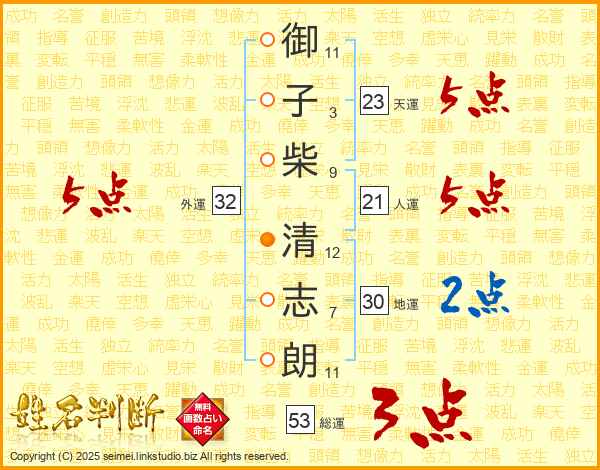 御(11画)子(3画)柴(9画) 清(12画)志(7画)朗(11画)