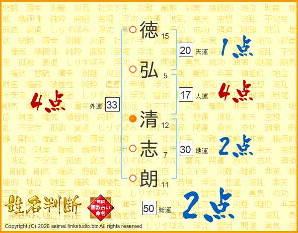 徳(15画)弘(5画) 清(12画)志(7画)朗(11画)