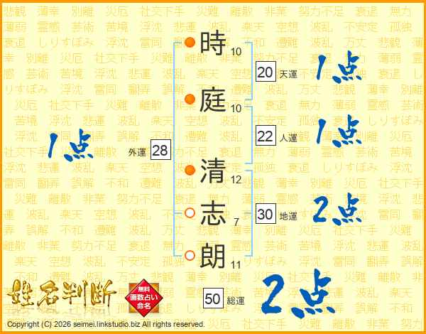 時(10画)庭(10画) 清(12画)志(7画)朗(11画)