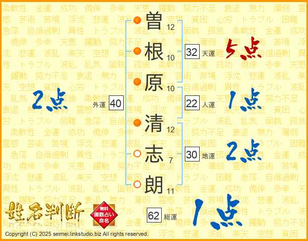 曽(12画)根(10画)原(10画) 清(12画)志(7画)朗(11画)