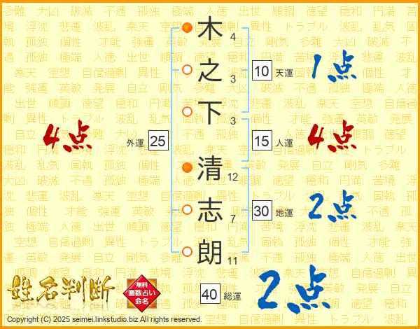 木(4画)之(3画)下(3画) 清(12画)志(7画)朗(11画)