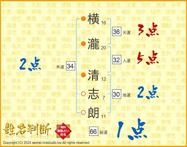 横(16画)瀧(20画) 清(12画)志(7画)朗(11画)