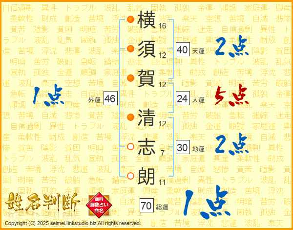 横(16画)須(12画)賀(12画) 清(12画)志(7画)朗(11画)