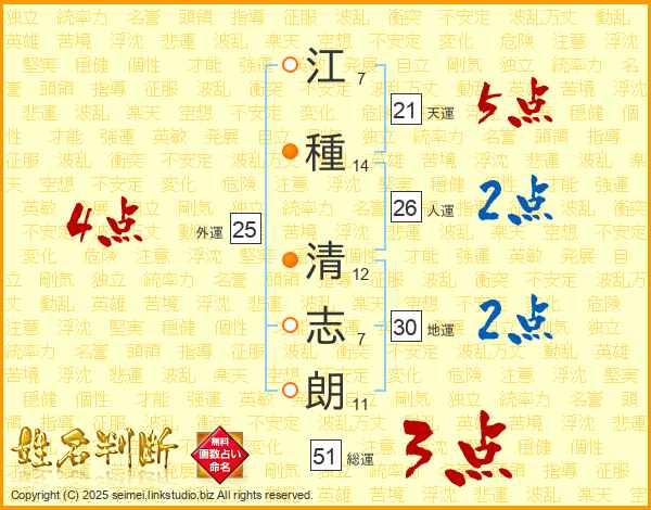 江(7画)種(14画) 清(12画)志(7画)朗(11画)