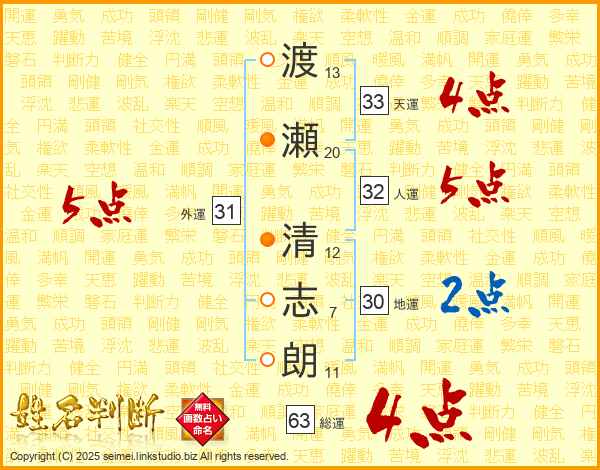 渡(13画)瀬(20画) 清(12画)志(7画)朗(11画)