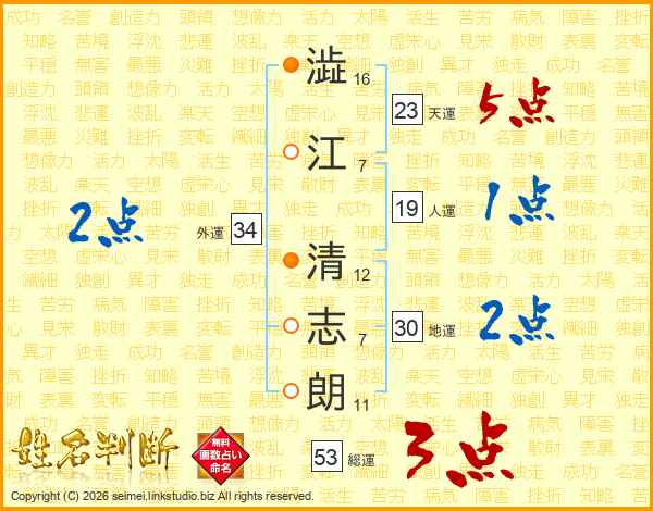 澁(16画)江(7画) 清(12画)志(7画)朗(11画)