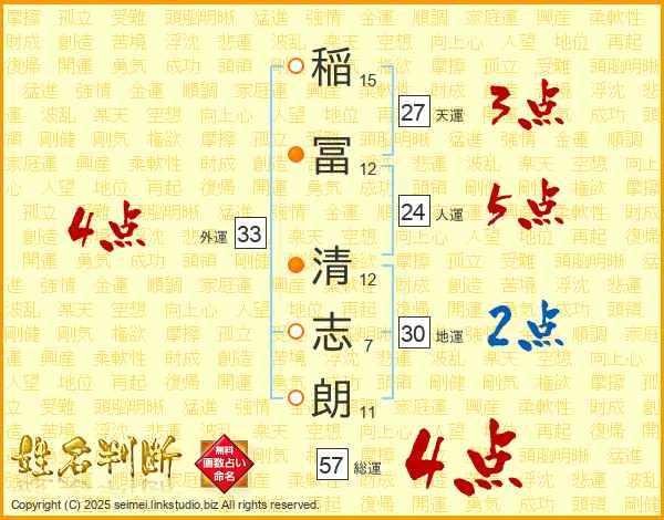 稲(15画)冨(12画) 清(12画)志(7画)朗(11画)
