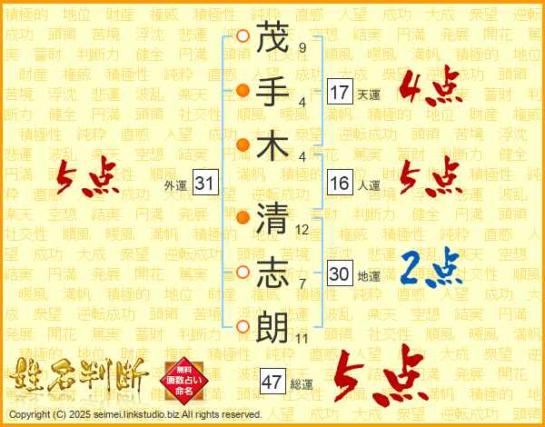 茂(9画)手(4画)木(4画) 清(12画)志(7画)朗(11画)