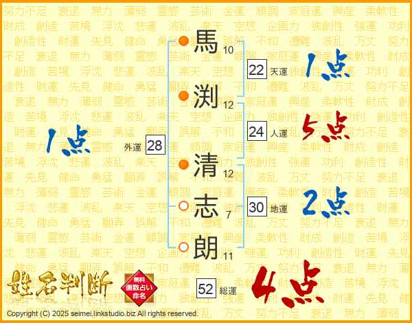 馬(10画)渕(12画) 清(12画)志(7画)朗(11画)