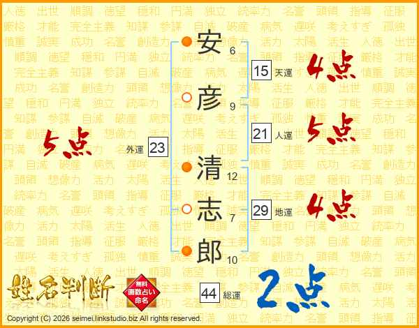 安(6画)彦(9画) 清(12画)志(7画)郎(10画)