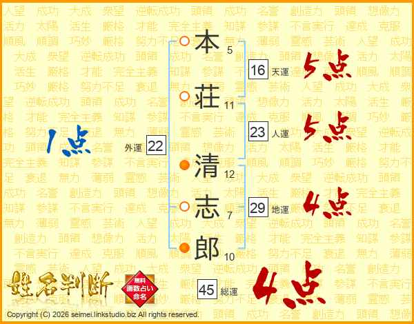 本(5画)荘(11画) 清(12画)志(7画)郎(10画)