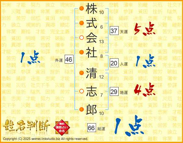 株(10画)式(6画)会(13画)社(8画) 清(12画)志(7画)郎(10画)