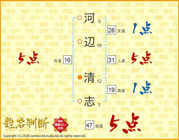 生活面を象徴する運勢です。外部から受ける影響力を表し、結婚運、家庭運や職場、環境への順応性を表します。総運から人運を引いた画数。姓や名が1文字の場合を除く。