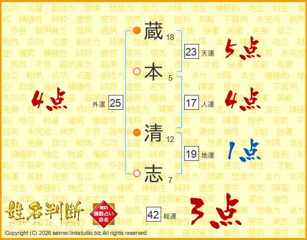 あなたの人生を表す1番重要な運勢です。生涯を通じて影響する総合運となり、主に50歳以降の晩年期に影響を及ぼします。苗字と名前の合計画数。