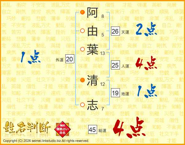 阿由葉清志さんの天運は26画の2点!