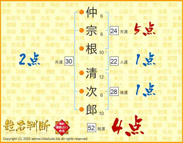 仲(6画)宗(8画)根(10画) 清(12画)次(6画)郎(10画)