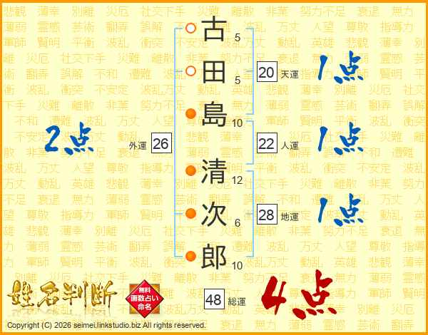 古(5画)田(5画)島(10画) 清(12画)次(6画)郎(10画)