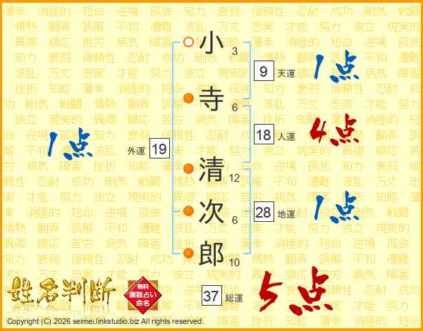 小(3画)寺(6画) 清(12画)次(6画)郎(10画)