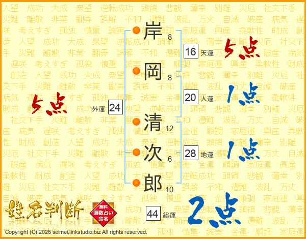 岸(8画)岡(8画) 清(12画)次(6画)郎(10画)