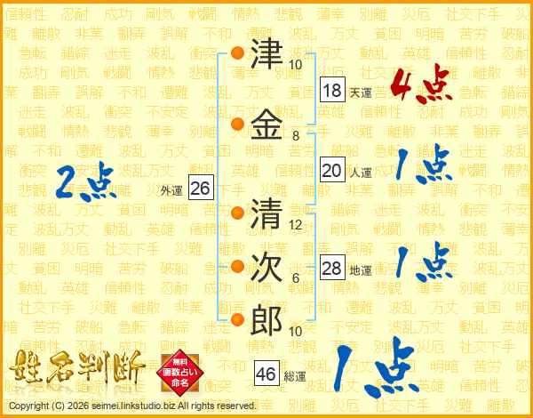 津(10画)金(8画) 清(12画)次(6画)郎(10画)
