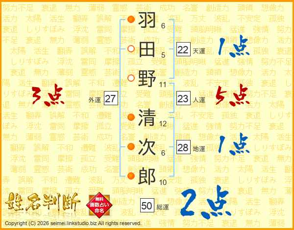 羽(6画)田(5画)野(11画) 清(12画)次(6画)郎(10画)