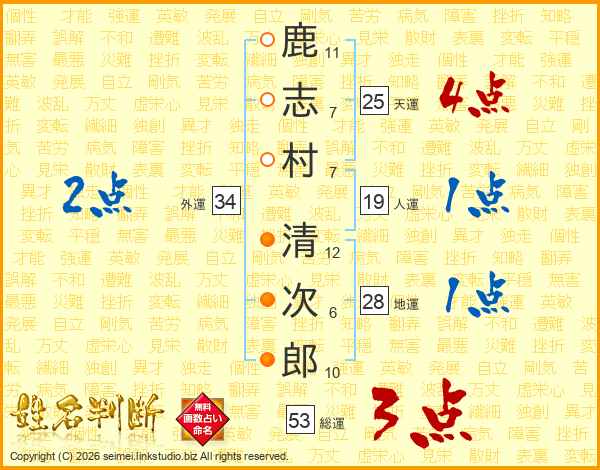鹿(11画)志(7画)村(7画) 清(12画)次(6画)郎(10画)