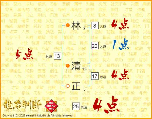 生活面を象徴する運勢です。外部から受ける影響力を表し、結婚運、家庭運や職場、環境への順応性を表します。総運から人運を引いた画数。姓や名が1文字の場合を除く。