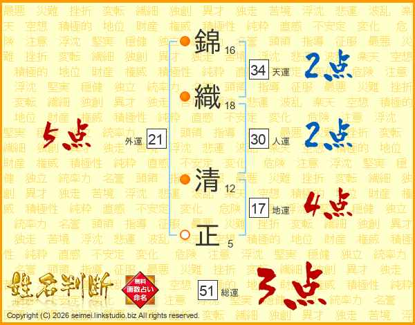 錦(16画)織(18画) 清(12画)正(5画)