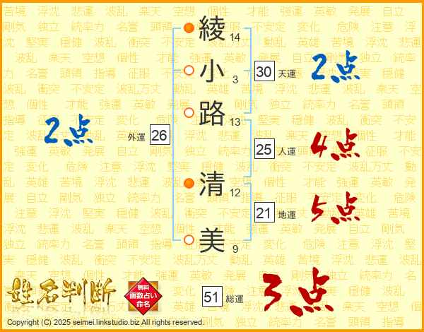 綾(14画)小(3画)路(13画) 清(12画)美(9画)