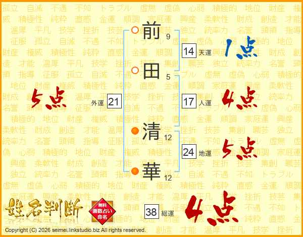 生活面を象徴する運勢です。外部から受ける影響力を表し、結婚運、家庭運や職場、環境への順応性を表します。総運から人運を引いた画数。姓や名が1文字の場合を除く。