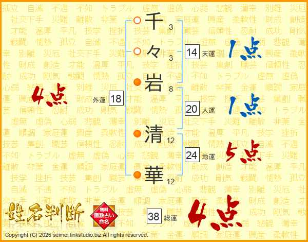 千(3画)々(3画)岩(8画) 清(12画)華(12画)