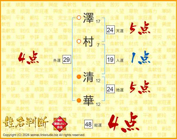 澤(17画)村(7画) 清(12画)華(12画)